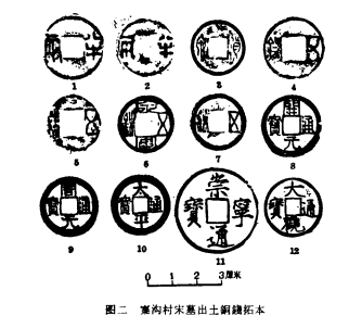 (二)铜钱394枚。其中包括有西汉文帝时四铢半两十枚,新莽货泉六枚,东汉五铢七十二枚,南朝剪轮五铢三枚,北魏永安五铢二枚,隋五铢六枚,唐开元通宝一二五枚,五代周元通宝三十二枚,北宋太平通宝五十六枚,崇宁通宝四十八枚,大观通宝三十四枚(图二)。