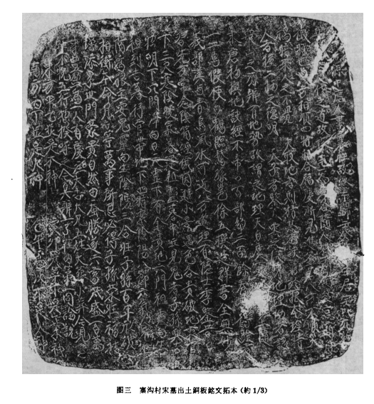 (三)有字铜板1块。铜板为方形,四角抹圆,保存基本完整,只在右下端蚀有小残孔三个,个别文字脱损。铜板长37.5、宽35.5、厚0.05厘米。铜板一面有铭文,系用一种工具击砸而成的阴文,大多淸晰可认,字痕内原来都塡有红色,现已大部脱落,全文自右竪读.共十八行,毎行二十至二十二字(图三)。