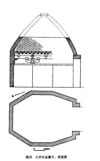 此墓为砖砌单室,形制与上述义井村金墓相同,墓室西北长3.03、东西宽2.5、高2.93米。墓底铺方砖一层,墓门以卧丁砖封闭,门高1.15,长0.52、宽0.95米,砖长35、宽17.5、厚5厘米。