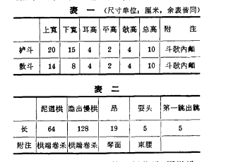 墓室均仿木构建筑形式砌造,八角各以红色画一倚柱,柱头砌出斗楼一朵,为単抄単昂五铺作,斗棋材高16、梨高6厘米(图版陆,8)。无补间铺作。斗桃尺寸如表一、二