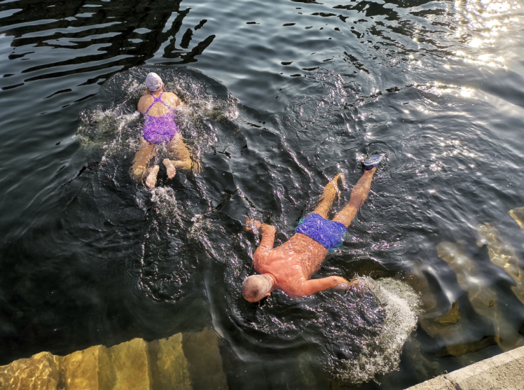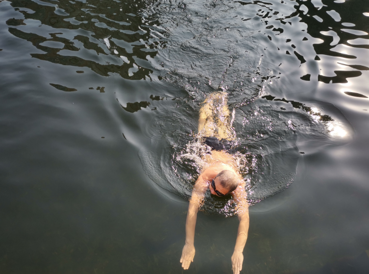 一个猛子扎入水中,老人们在水中像一条条自由的飞鱼,“刷”地一下划出去好远,蛙泳、自由泳、仰泳……各种泳姿来回切换,双手划出的水花在冰冷的河水中绽放。
