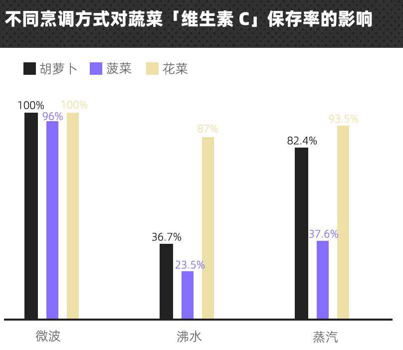 蔬菜富含维生素、膳食纤维和抗氧化物质。加热对膳食纤维影响不大,但维生素和抗氧化物质怕热又易溶于水。研究发现,在达到同样熟度的条件下,微波蔬菜维生素C的保存率显著高于水煮菜,同时也不输健康的蒸菜。