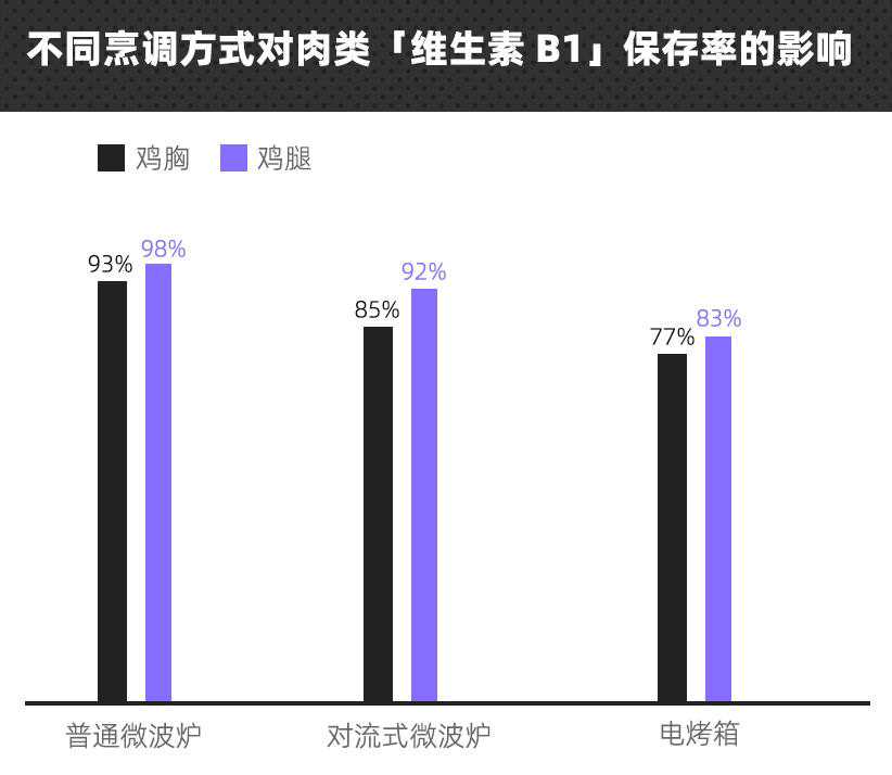肉类可提供优质蛋白质、B族维生素等营养。适当加热可提高蛋白质的消化率,但B族维生素对热敏感,易被破坏。但科研人员研究发现两种微波加热方式对B族维生素的保存率均高于烤箱。