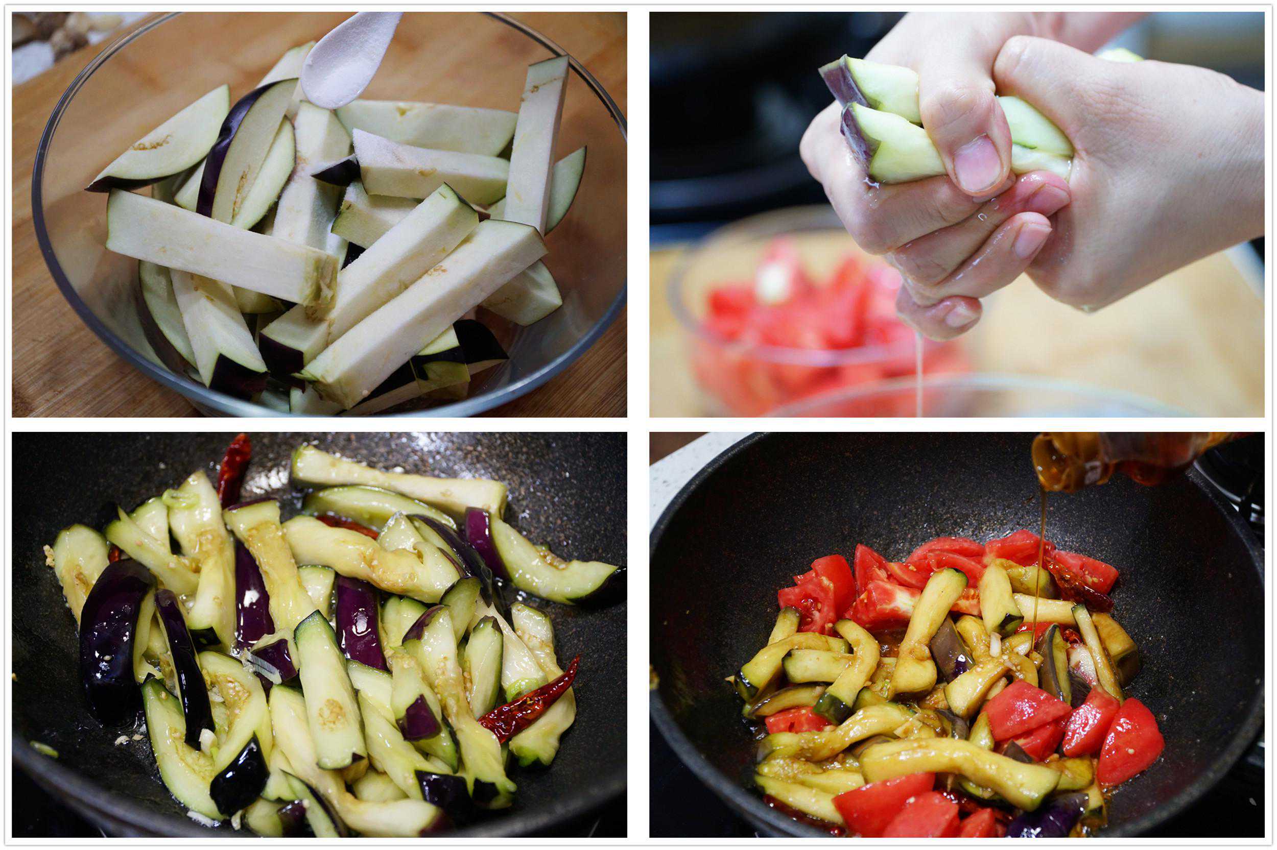 1、将茄子切成长条,撒上去两勺盐,抓均匀后静置在一边等待出水,抓在手中捏水,将茄子中大部分水分都捏掉,然后再炒就很容易了。