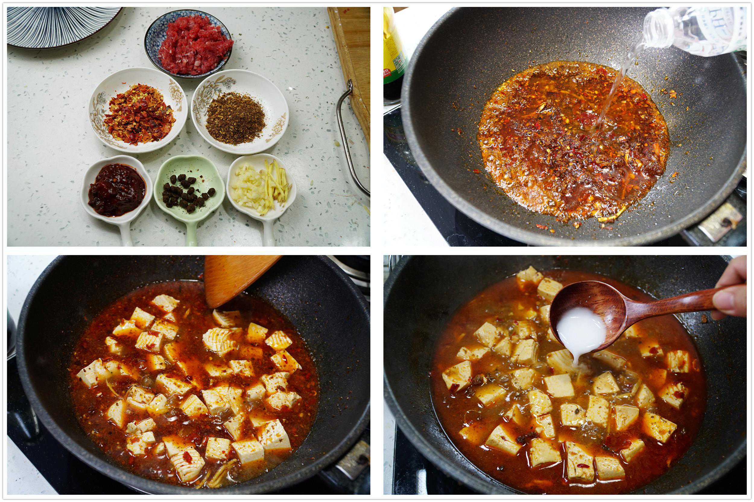 7、3勺干淀粉加5勺水兑成的水淀粉准备勾芡,保持中火开锅状态,浇入一勺水淀粉,然后用铲子慢慢推开,稍等一会,再淋入一勺水淀粉,继续推开,如此反复三次,直到汤汁到达满意的粘稠程度。