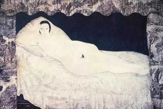 这种“乳白色”藤田嗣治又是如何调制的?据他本人所说,为了取得洁白无瑕的色调,他把牡蛎壳磨粉调制到颜料中,为了表现细线,必须制作光滑和有光泽的画布,并且在画布上均匀涂上一层滑石粉,然后借用毛笔,以浮世绘中“晕色”技法以暖灰为中间色,营造出肌肤的立体感。这样他笔下的裸女既具有东方女性的温婉优雅,又具有异国情调,裸女肤如盛雪、吹弹即破,更增强了可触感。在其他同题材的创作中,他也运用水墨、油彩、金箔等多种混合材料,在嗣治看来,作为日本人来到西方,就必须在油画中使用日本的笔和日本的墨,只有彻底理解西方,才能知晓东方的优秀之处。