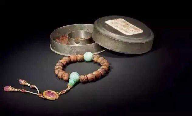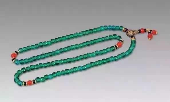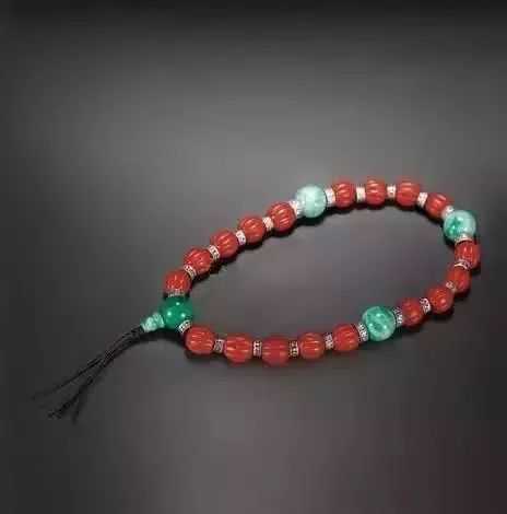 清代橄榄核雕人物配红绿彩云龙纹瓷珠手串