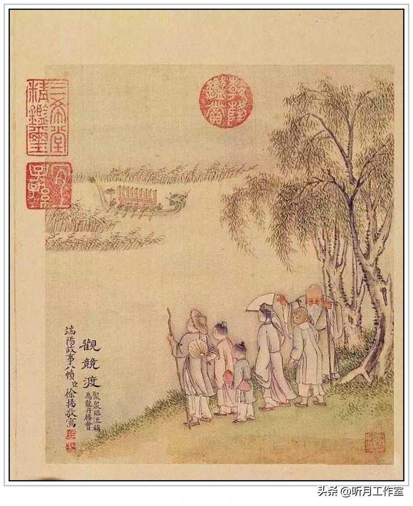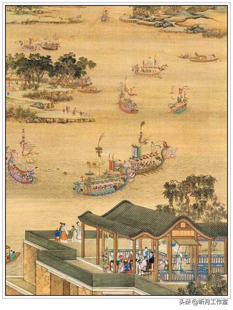 清代著名画家徐扬《端阳故事图》之《观競渡》清乾隆宫廷画师徐扬绘,端阳故事八帧之一《观競渡》,此图册构图严谨精妙,人物造型秀逸生动,线条遒劲流畅,色彩明丽典雅,显示出作者较强的写实功底和乾隆朝宫廷绘画工整清丽的笔墨特点。题:“观競渡,聚众临流称为龙舟胜会。”