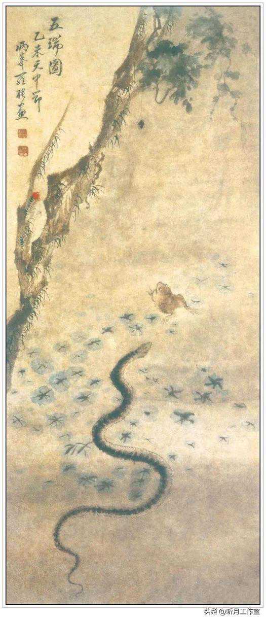 清代著名画家罗聘《五瑞图》纵91.2厘米、横38.7厘米,天中节即端午节。图中所绘蛇、壁虎、蜈蚣、蜘蛛,金蟾是为“五毒”,民间用来驱除邪祟祈求平安,故称“五瑞”。此幅构图简洁,立意巧妙,标新立异。