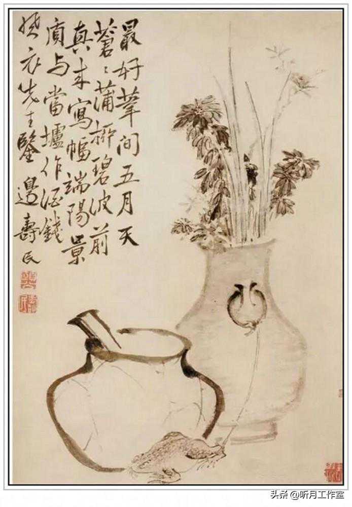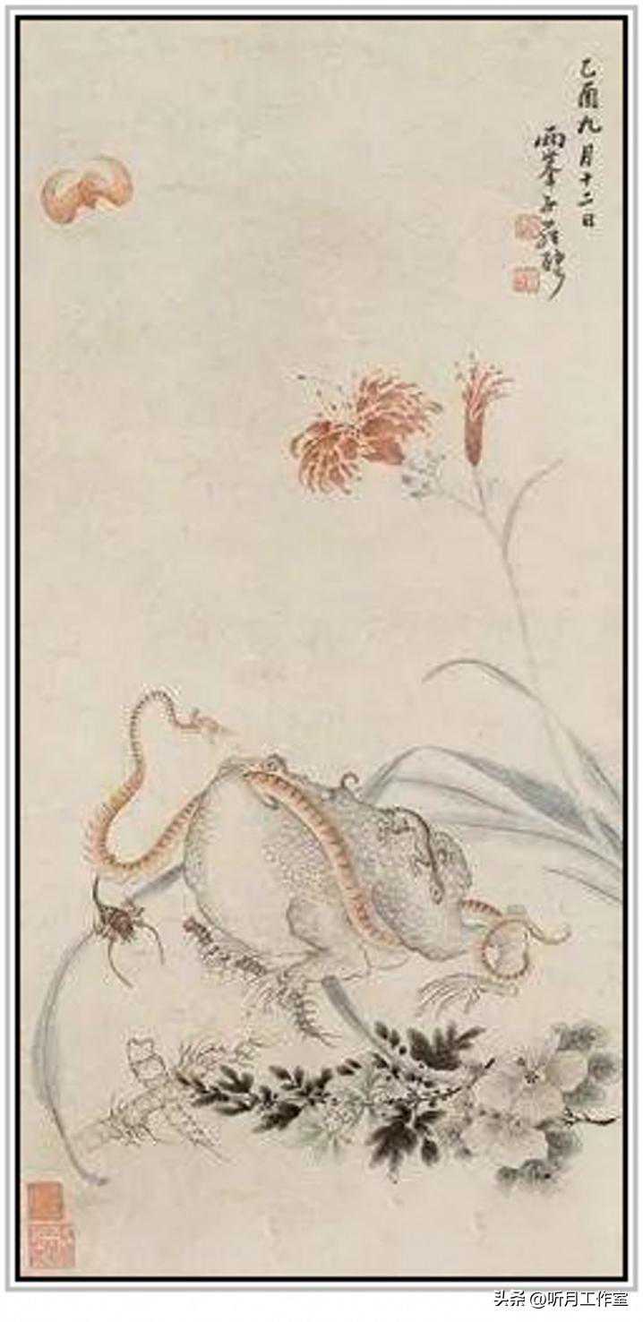 清代著名画家边寿民《端午即景图》纵77厘米横54厘米,纸本,沈阳故宫博物院藏。早在《帝京景物略》中,便有端午捉蟾蜍之习的记载,所以在此画中,端午杂卉与蟾蜍并列一图,便是极为应景的了。有趣的是,边寿民还自题诗曰:“最好苇间五月天,苍苍蒲柳碧波前。兴来写幅端阳景,质与当垆作酒钱”,其趣味性已然甚于应景之需。