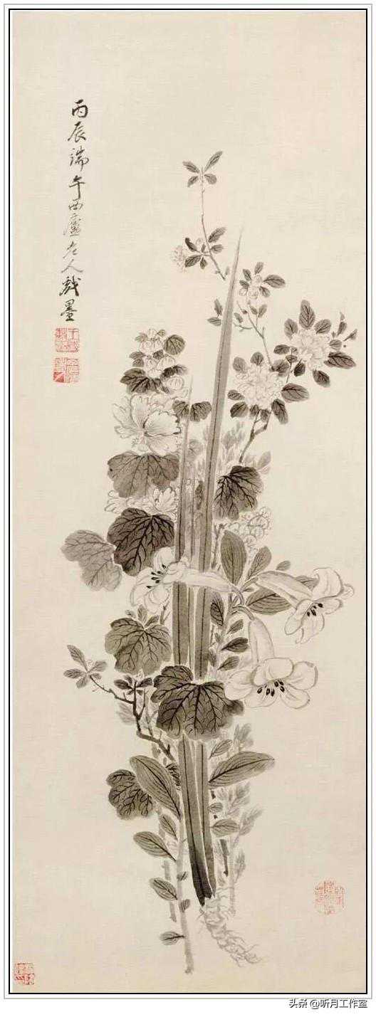清代著名画家王时敏《端午图》轴,是一幅画家晚年较为罕见的墨笔花卉。此图是王时敏晚年为端午节所作的节令画,描绘了菖蒲、蜀葵、玉簪以及蔷薇等几种初夏的时令花卉。该图所绘花卉笔墨简练洁净,清新古雅,表现了吉祥喜庆的意境。