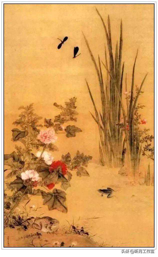 此画以挺秀细润的笔法,将菖蒲、蜀葵、蜻蜓、蟾蜍和青蛙等自然景物有机结合起来。构图简洁、疏密相宜,用笔工整,严而不板,秀润中略得野趣。花的娇态,叶的反正,蜻蜓的飞翔,青蛙的游姿,描绘的都很细致,具有质感和动势,其写实功力,较为深厚。