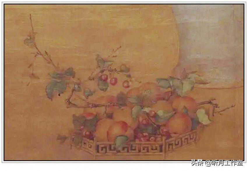 《燕京岁时记》曾谈到北京地区特重樱桃的习俗:“每居端阳以前,府第朱门皆以粽子相馈贻,并副以樱桃、桑葚、荸荠、桃、杏及五毒饼、玫瑰饼等物,其供佛祀先者,仍以粽子及樱桃、桑椹为正供”。郎世宁图中所绘景物与上述记载正相吻合,它真实地反映了淸宫端午景的制作情况。