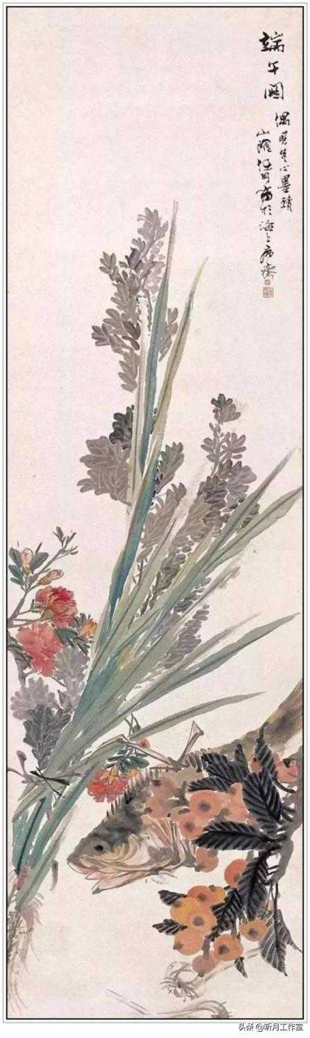 清代著名画家任伯年《端午图》任伯年的《端午图》素朴清雅,以直立的艾草、菖蒲、蜀葵为主要表现对象,以地面上摆放的枇杷、蒜头为辅。寥寥几笔,韵味十足,似乎可见作者饮黄酒小酌的悠闲场景。端午节吃黄鱼是江浙一带的风俗,任伯年小酌的时候自然忘不了这一点。