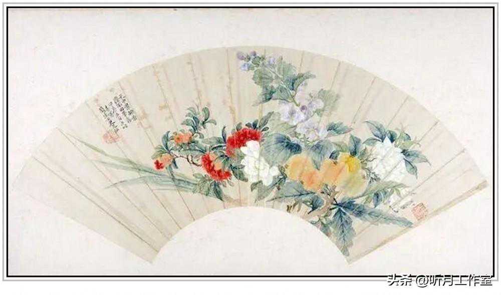 清代著名女画家恽怀英《天中景映图》扇页,北京故宫博物院藏。扇页自题:“天中景映图。法南田笔意。甲辰五日午时喜写。兰陵女史芝仙。”图绘牡丹、枇杷等各色花果,它们以五彩染就,不见笔痕,色调巧妙搭配,浓淡变化自然,脱去尘俗,于妍丽中见秀雅,粉墨中露清姿,颇得恽寿平花鸟画灵秀天趣之美,呈现出一派喜庆祥和的景象,与作者自题“喜写”的意愿相契合。
