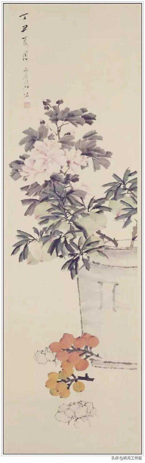 清朝著名画家虚谷《五瑞图轴》轴,纸本设色画,纵177.8厘米,横46.3厘米,图中所绘蜜桃、枇杷、百合等是日常生活中常见的花果,给人以朴素、亲切的感觉。本幅款署:“丁丑夏月。虚谷。”钤“虚谷书画”朱文印。“丁丑”为清光绪三年(1877年),虚谷时年55岁。瓶花是虚谷喜画的题材之一。图中蜜桃、枇杷、百合等是日常生活中常见的花果,给人以朴素、亲切的感觉。图中瓷瓶及百合用勾染法描绘,线条简练,造型准确;花卉、蜜桃及枇杷用没骨法表现,层层渲染,增添了花果的层次感及质感。画面设色润泽鲜艳,富有淡雅清新的韵味。