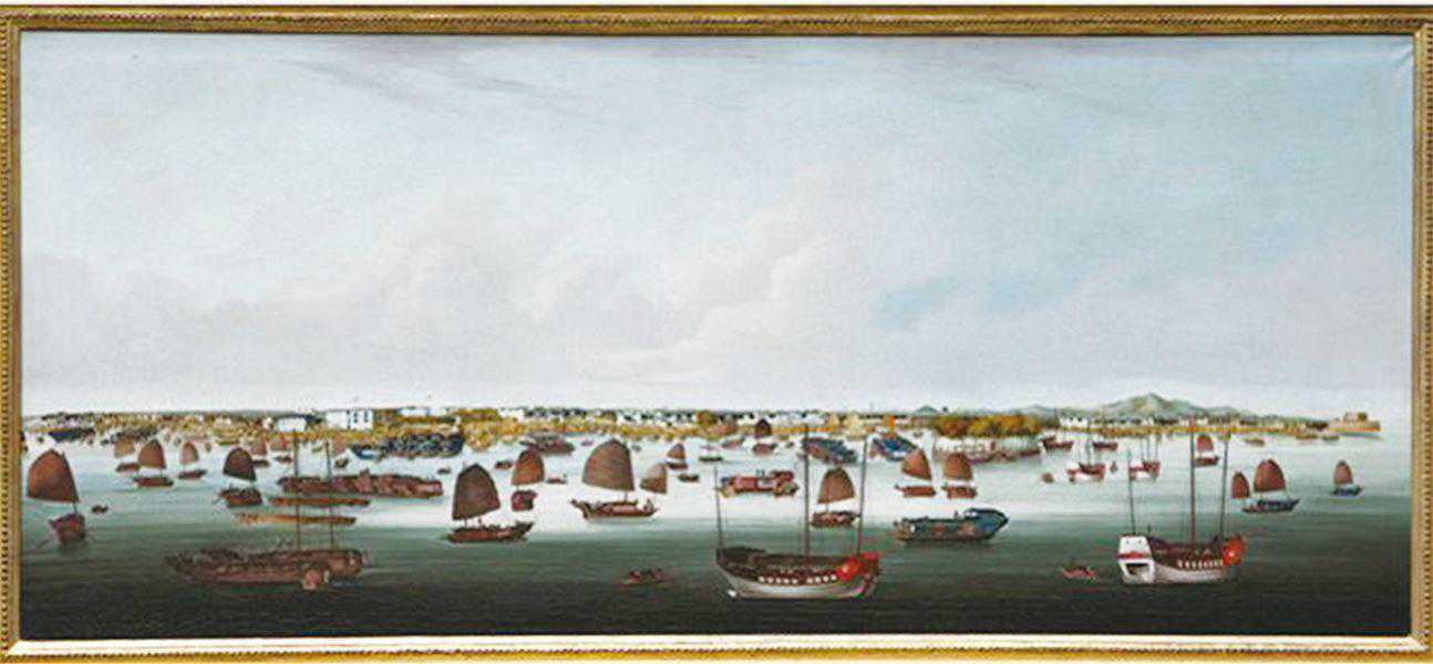 《广州港全景图》为煜呱代表作品,画框背部上方有“Youqua”画室标签残片。画面描绘了从沙面、十三行商馆区、海珠炮台直至大沙头附近的东水炮台一带珠江北岸的广阔风景,以洋画的技巧写实地记录了特定时期广州的历史风貌,是当时中国其他城市罕见的图像记载,具有较高的历史价值与艺术价值,堪称清代广州的手绘照片、珠江版的“清明上河图”。