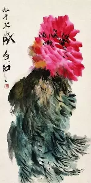 用笔用墨已经是天籁,是神在走,而不是手在走,笔墨中包孕的精气神完全超越了白石老人的身体健康的状态,是修养在完全自由自然自在自为的状态下的释放,画中的牡丹似花非花,似叶非叶。风从画外吹来,花叶舞动着波浪般的韵律,绚丽的色彩,灵动的姿态,洋溢着灿烂而又浓郁的生命力。