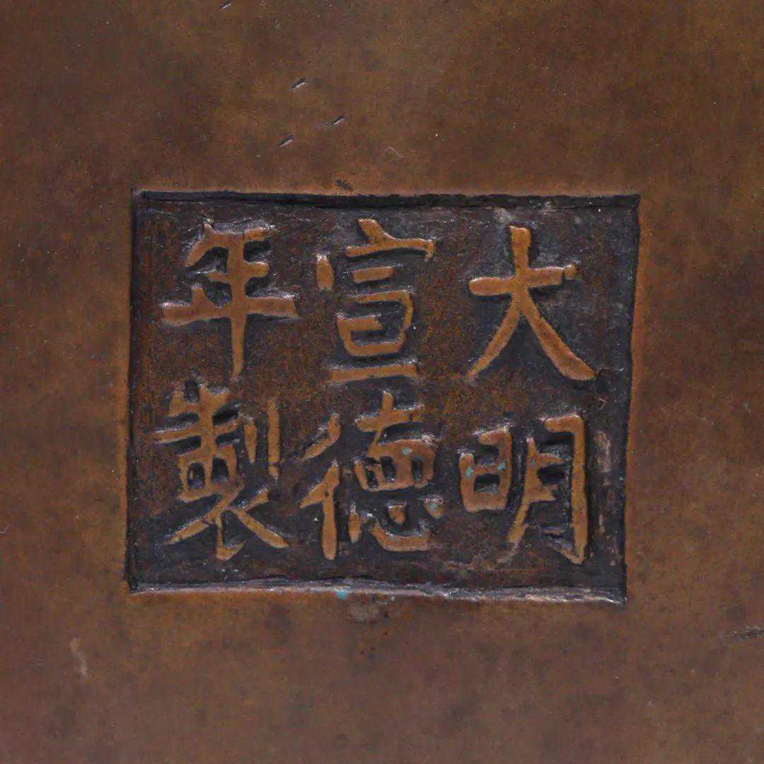 此件为清代仿大明宣德炉,筒式造型,器壁微斜,上舒下敛,口径宽,炉身矮,底承三云板足。弦纹筒炉的造型在宋代青瓷中即有,传世铜质者有三式:一为全身皆以弦纹装饰;二为弦纹九道,平均分三段于器沿、器腹、器足,亦称九元三极炉或九思炉;三为弦纹六道,三段各铸三道、两道、一道。本件拍品外壁凸饰七道弦纹,口沿、底缘自成一道,总计三组九道,为第二式弦纹筒炉。炉底开框錾刻“大明宣德年制”六字,其中“德”字心上缺一横,为仿明代宣德风格的底款。