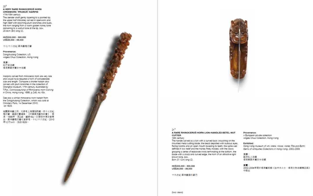 这场风波的导火线是「木兰藏中国犀角雕刻」专场,一共21件犀牛角工艺品,形形色色,由拍卖常见的杯、尊、葫芦器,到罕有少见的发簪、铡刀都有,悉数为香港藏家蔡刘木兰所有。