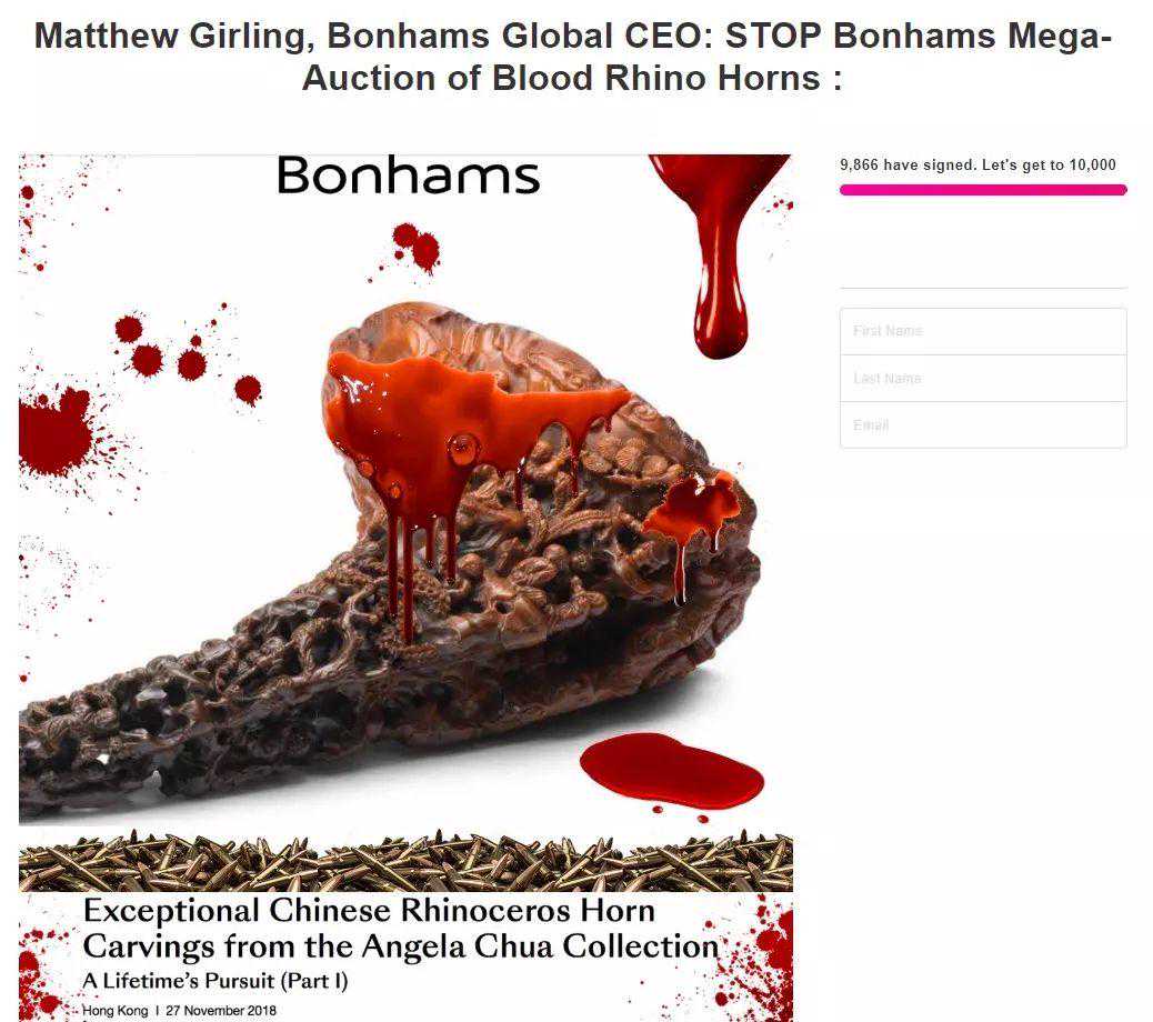 惟事情愈演愈烈。动物团体发起网上联署,以犀角专场的图录封面为照片,加上血和子弹在其上,点名邦瀚斯的全球行政总裁格尔林(MatthewGirling),要求终止这场「不道德」的拍卖。截稿为止,联署已经获得9,866人支持。