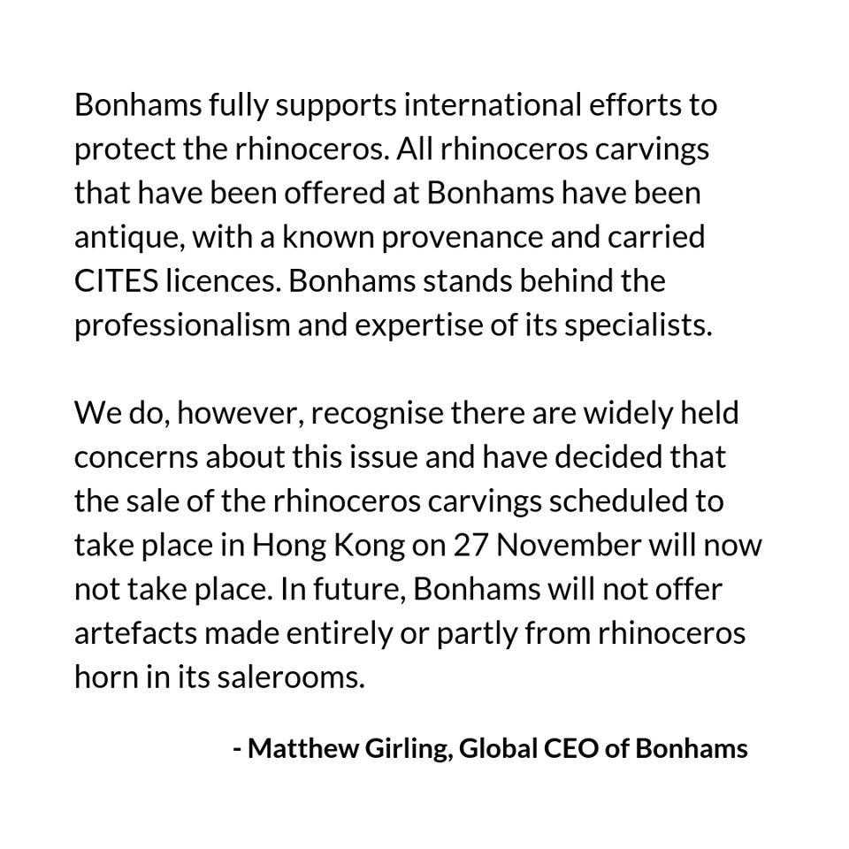至今日早上,格尔林终于发表声明,宣布取消27日在香港的犀角专场拍卖。邦瀚斯亦许下承诺:将来不会拍卖任何犀牛角制品。野生救援WildAid对邦瀚斯取消拍卖一事感到欣慰,感谢对方回应了国际社会呼吁。与此同时,动物团体的诉求转向了另一间国际拍卖行「Thankyou,Bonhams!Sotheby'snext?」如果事情有新发展,我们会再为你报道。