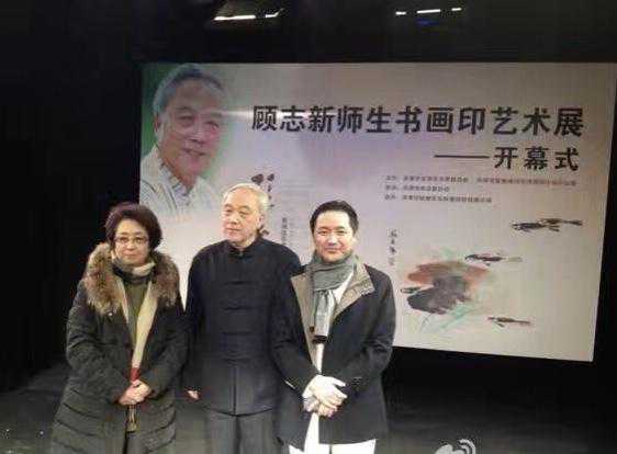2014年,制片人姚泽民(左二)出席顾志新(左一)艺术展开幕式