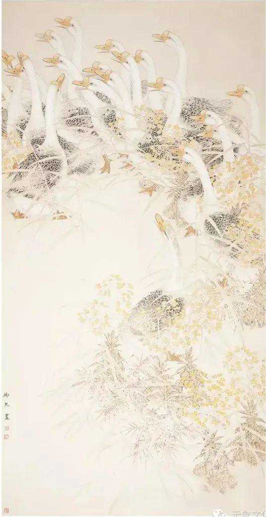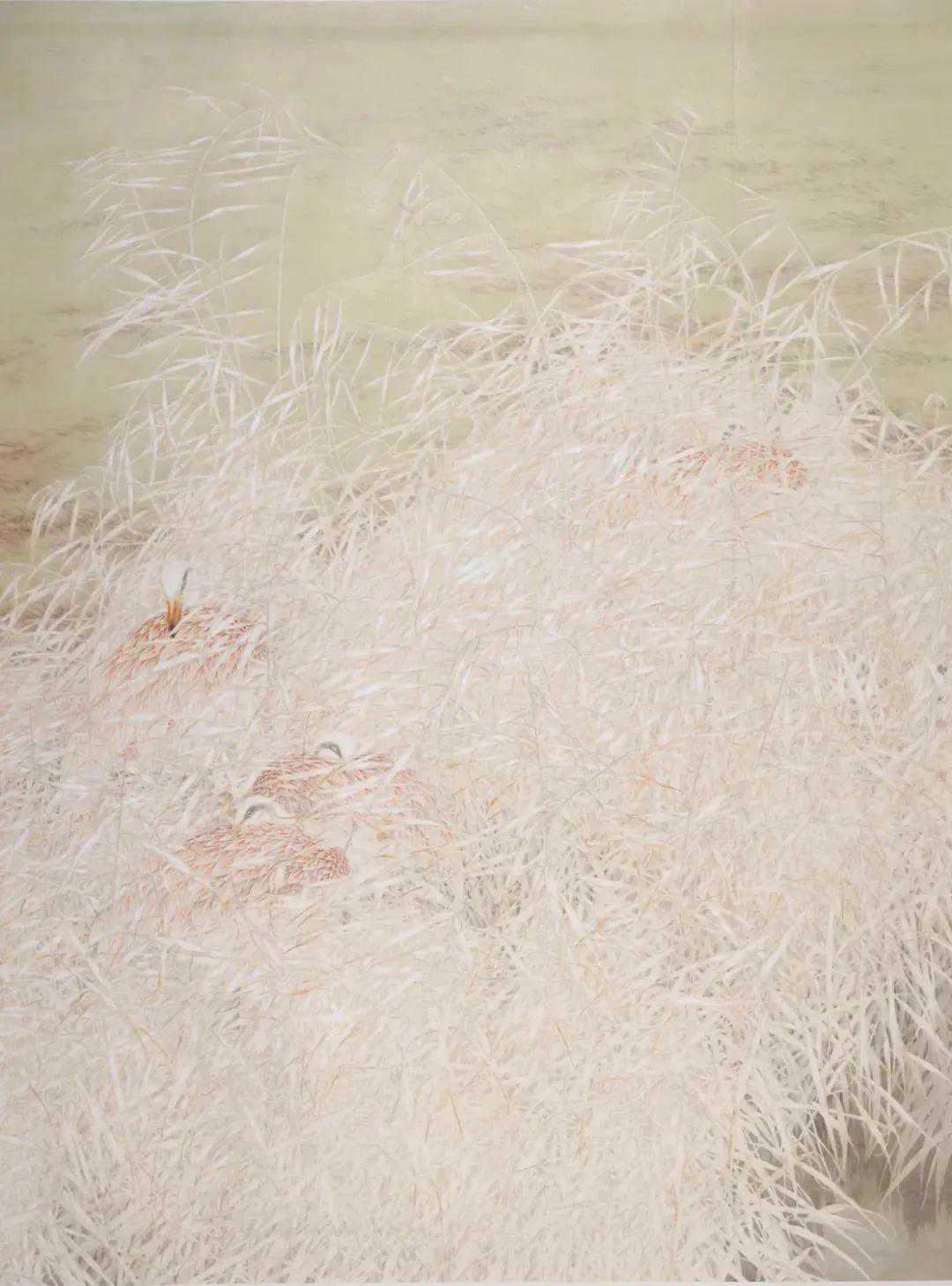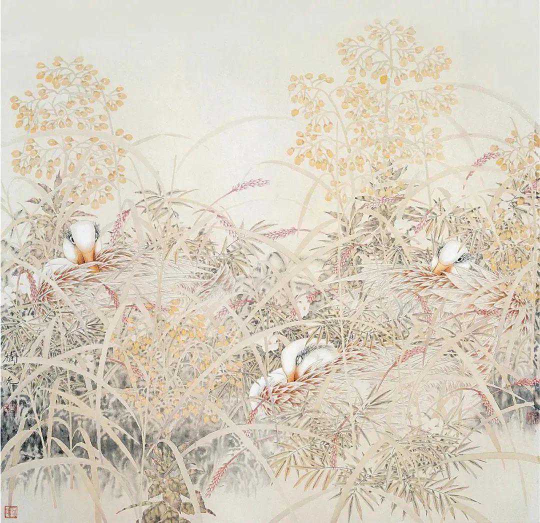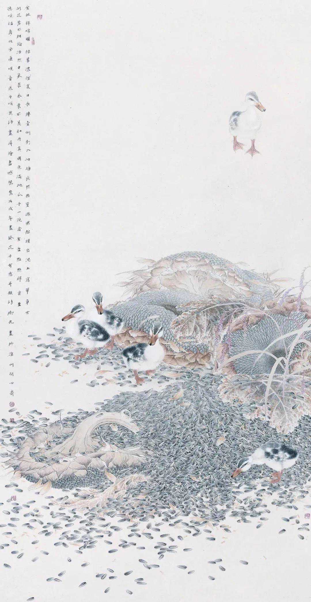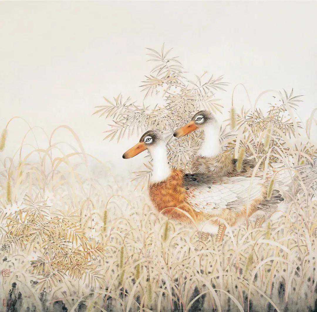 在他的绘画中,你能轻易品查出他对自己所描绘事物的体察和爱意,像《灿灿金玉》中的玉米和瓢虫,《莲鱼和合》中的红色游鱼,《秋来无处不清凉》中的群鸭,《满树繁花》中的藤花……在树允先生的绘画中,他不是完全遵从于写实原则的,而是在写实的基础上写意,进行着摒除和“清洁”,这使他的画面带有较强的“唯美”,让尽可能多的美被保留下来。