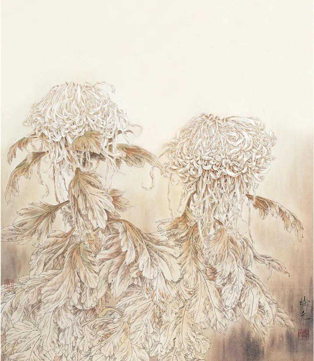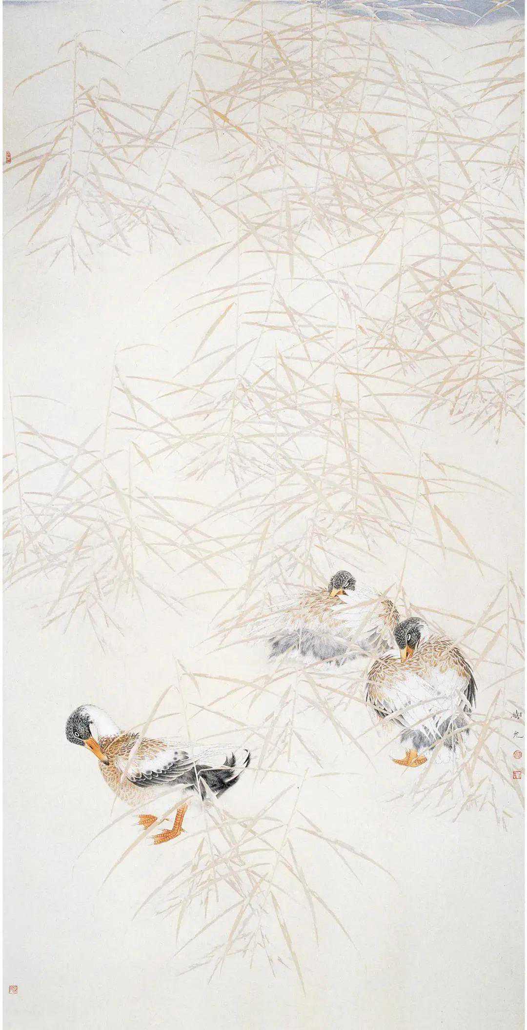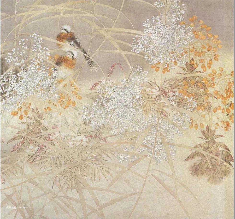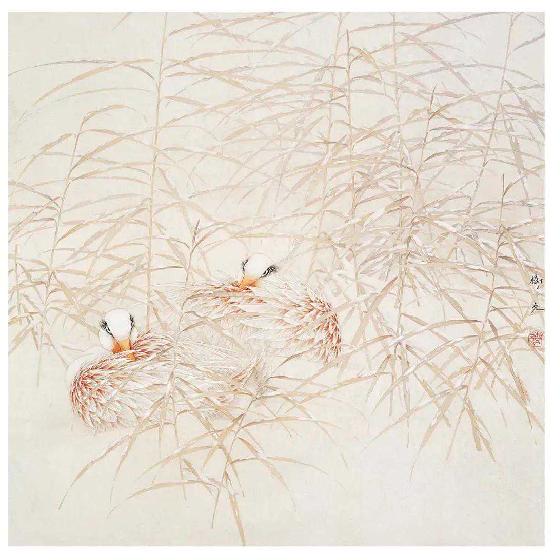在品观刘树允的绘画时,能够明显感觉其充盈于画幅中的“暖调”,他的绘画有着淡淡的热度。这“暖调”不是由色彩的强烈而生发的,不是,刘树允在设色时故意偏淡,甚至是工笔花鸟中少有的淡,它的暖不来自“重彩”或者暖色调颜色的运用而是隐含其中的温情,也就是说,它的暖不来自外而来自于内。