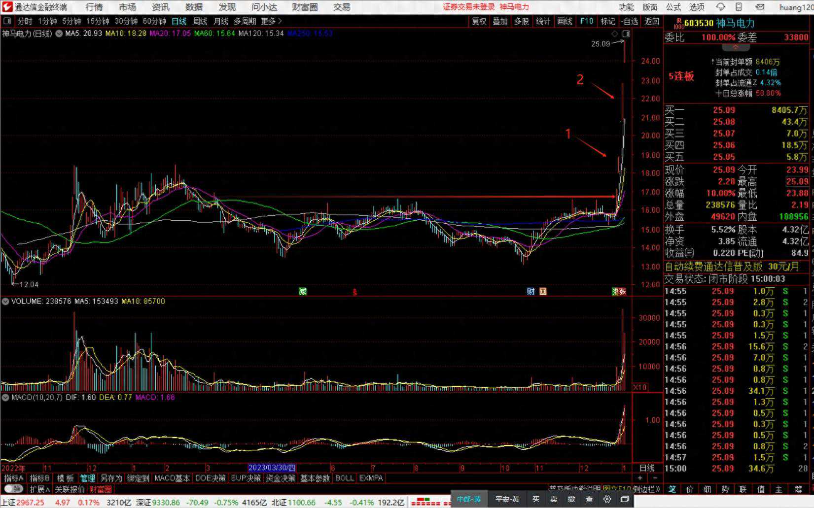 神马电力12月27日首板涨停,系统提示它属于特高压概念,板块内当天没有其他个股涨停;神马电力首板涨停突破了前面横盘的两个高位区域,站上年线,且短期均线多头排列,具备牛股的形态特征。
