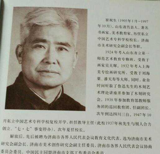 崔祝生,生于1905年,家在莒县汤家庄,是上海美术绘画研究所第一届研究生,当时的老师有潘天寿、刘海粟。求学期间,他还听过鲁迅先生的讲座。毕业后,曾在济南,四川担任多年教师。有了一点积蓄之后,他又曾与人合办艺术学校。