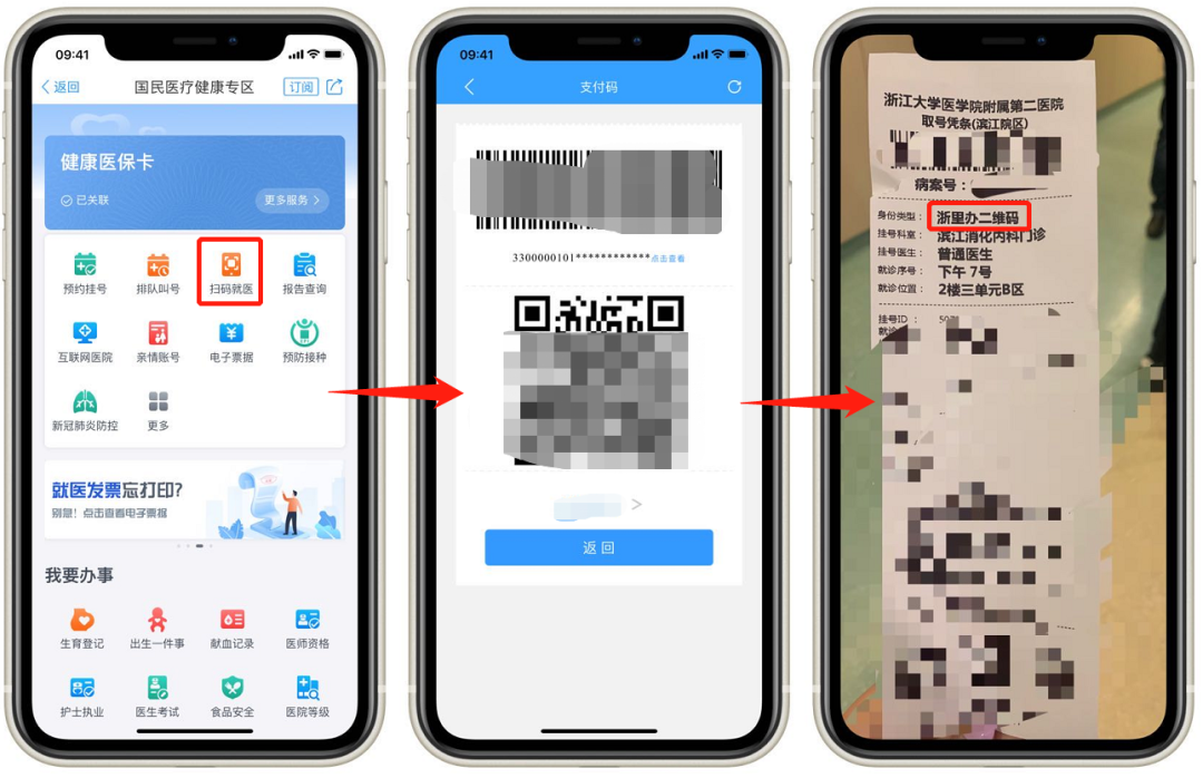 等到预约日,请准时前往医院取号看病,打开浙里办APP国民医疗健康专区【扫码就医】直接取号。