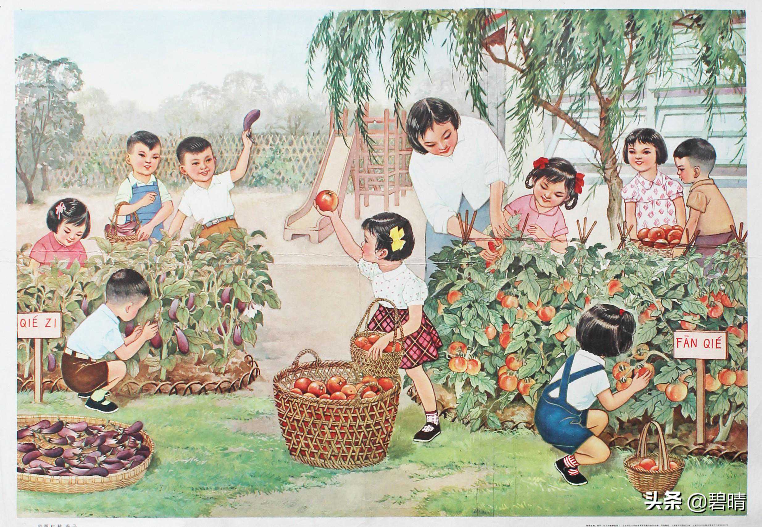 这幅挂图名为“收西红柿茄子”,从画面看应该是一幅为低龄儿童准备的教学挂图,场景是在某一个幼儿园里,今天老师带领孩子们到院子里不是玩滑梯游戏的,而是带小朋友们来收获农作物,也有助于区分西红柿和茄子。西红柿又叫番茄,估计很多小朋友光听名字分不清这两种作物有什么不同。在幼儿园院子里有一片种植区域,孩子们分成两组在老师的带领下,一组采摘了紫色长圆形的茄子,一组收获着又红又圆的西红柿。这应该算是当年的一种劳动实践课啦。