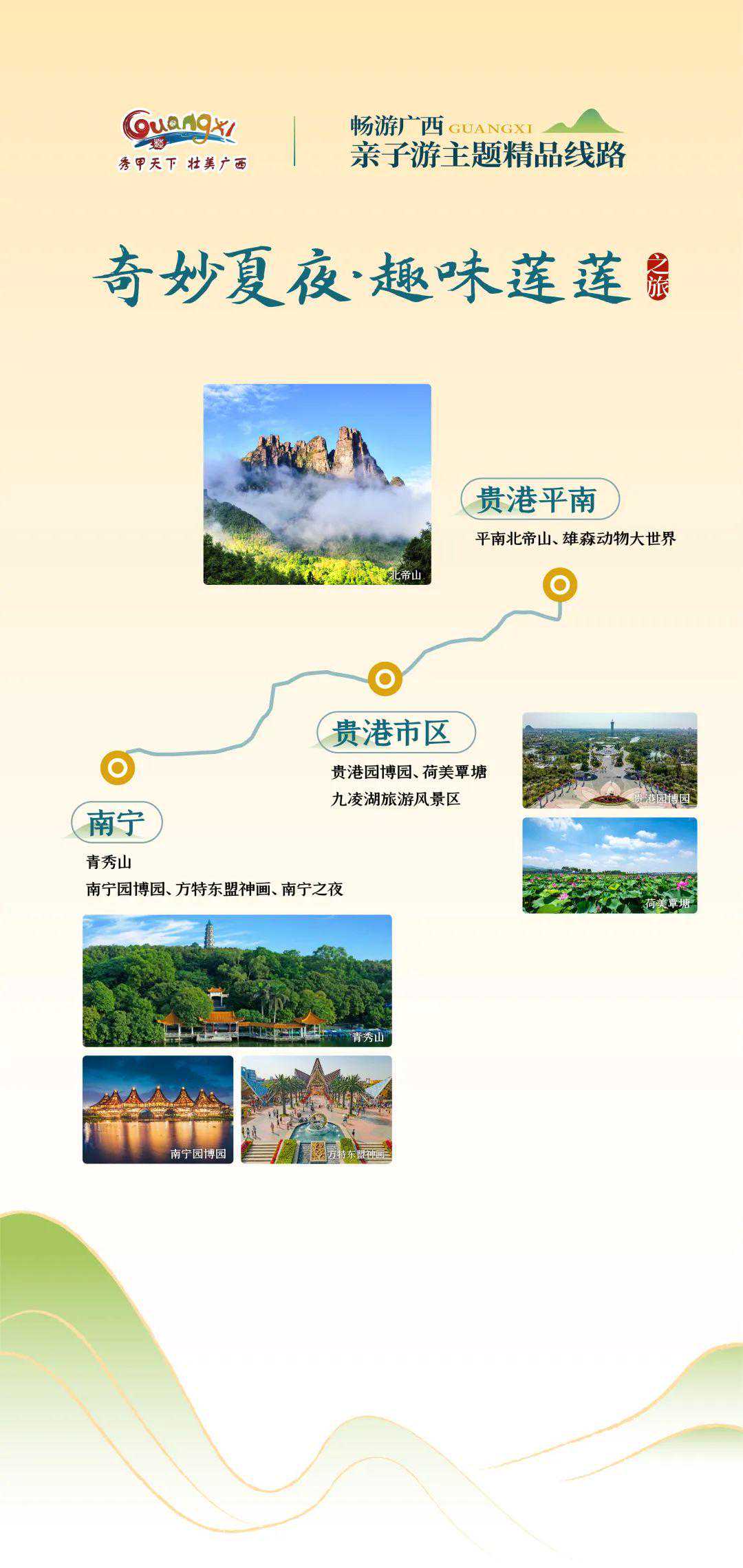 探趣夏夜,奇趣不停!在南宁青秀山夜间“森”呼吸;到方特东盟神画,一日玩遍东南亚;打卡新晋网红街区“南宁之夜”,解锁更多新玩法;到“荷城”贵港,感受“荷风”迎面;到平南北帝山丛林探险,勇闯雄森动物大世界!