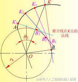 渐开线用一句话说就是假定一直线和其上一不动点,在该直线沿一个圆滚动时,那个不动点所走过的轨迹。它的好处显而易见,当两个渐开线互相啮合时,如下图。