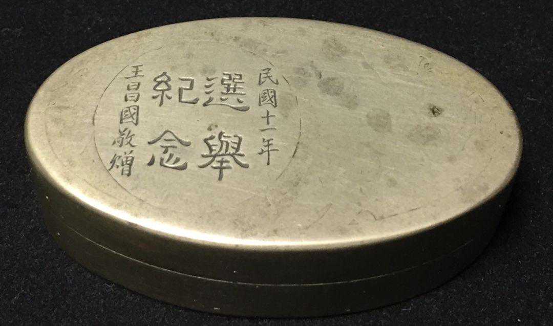 不久前,网友惠让我一方椭圆形小墨盒,黄铜制作,底铭为“聚隆”,盒面上刻有“民国十一年选举纪念”和“王昌国敬赠”字样。