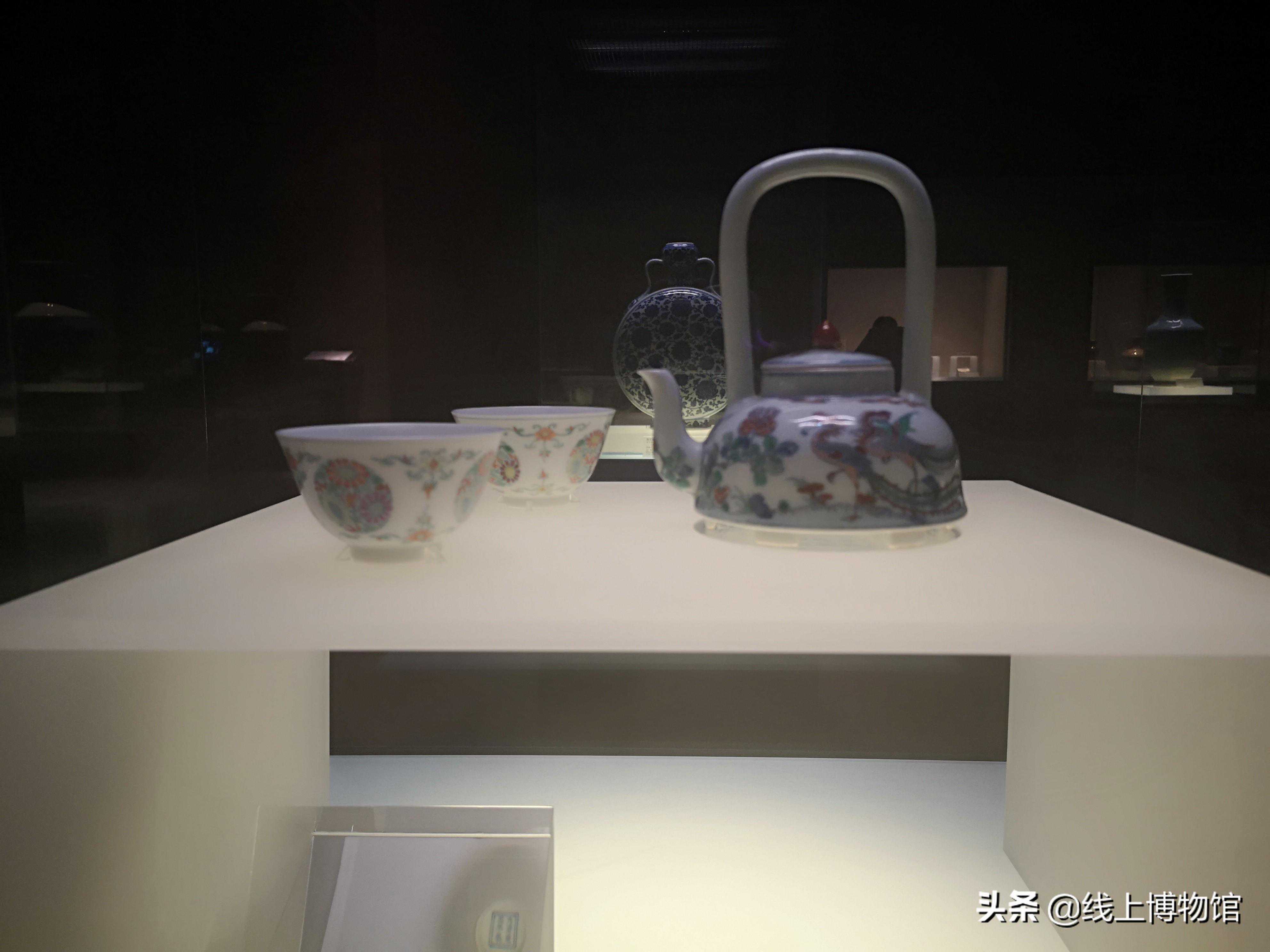 清-雍正斗彩团菊纹杯和斗彩五伦提梁图壶