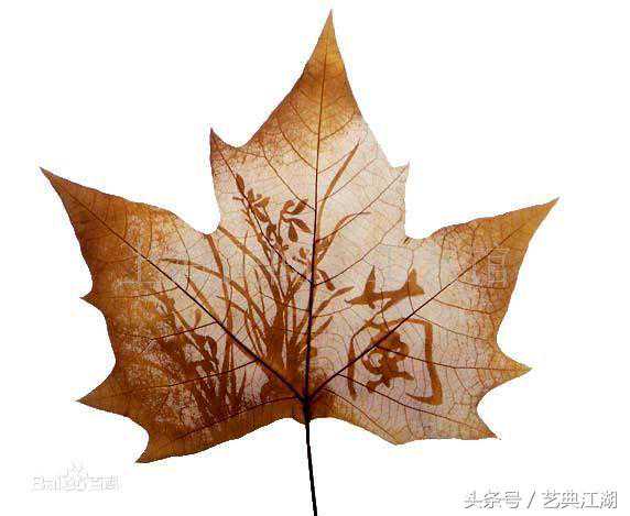叶雕,又称剪叶,取材秋季成熟的自然落叶,经手工在落叶上精雕细琢,成就精美的图案。