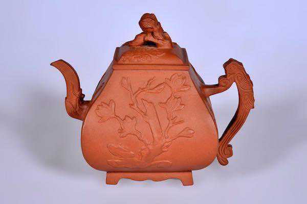 清康熙嘴为三弯,此壶制作精细,泥饰花纹细腻,壶嘴壶把是用石模拓印所致。贴花技艺早见于西晋青瓷器,在明末清初时才为紫砂壶所引用。当时外销欧洲的宜兴紫砂壶。趋向商品化,开始大量制造,壶上装饰几乎全部吸收瓷器的手法,因器思变,层出不穷,并将几种方法巧妙地结合在壶上,达到和谐统一。