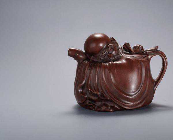 许四海早期作品,1984年在宜兴紫砂二厂制作而成,当时来往于上海的家与宜兴紫砂二厂之间,长途汽车上常见到瞌睡的老农抱着扁担,突发灵感。雕塑工艺融入紫砂壶中的一种尝试,它与传统围片,拍身桶成型法略有不同。