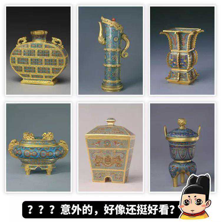 乾隆时期的掐丝珐琅,不仅外表弥漫着一股皇家浮夸气息,颜色也是富丽堂皇,金光闪闪。