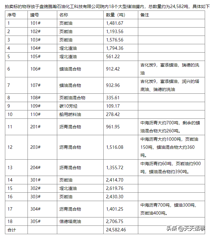 此次拍卖的油品都存储在专业的罐体中。油品种类比较多,包括页岩油、埕北渣油、蜡油混合物、船用燃料油、沥青混合物、信德塔底油、碳10芳烃等。总量为24582.46吨,其中页岩油量最多。