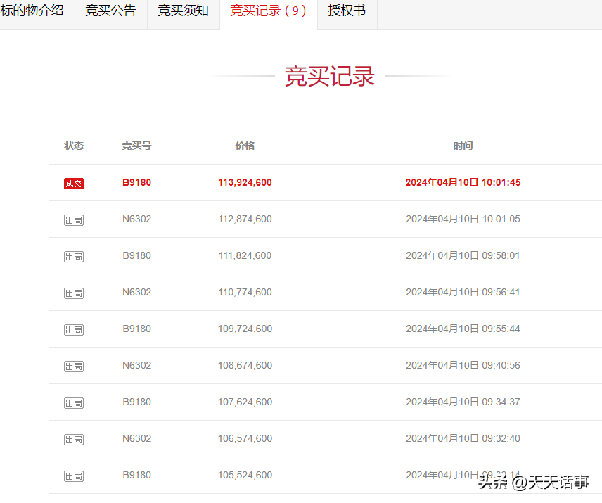 此次拍卖,起拍价是1.055246亿元起,拍卖只有两个人报名竞拍,整个拍卖过程并不激烈,2位竞拍者一共短暂加价了9次就结束拍卖了,以1.139246亿元成交,成交价只比起拍价高出840万元。