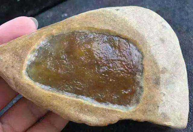 黄沙皮翡翠赌石,是翡翠原石经过流水搬运和表面风化后,形成的鹅卵石状的翡翠,赌石表面有一层黄色皮壳。