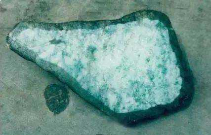 对于这一种色料,可以用强光照射,观察料石透明度,色的分布情况和裂绺的发育程度。在此同时,用强光地在绿色分布区的两侧和两端延长方向上搜集,是否用暗区存在。这种暗区即为灌色的进口,直径一般为1-2cm,近似圆形。
