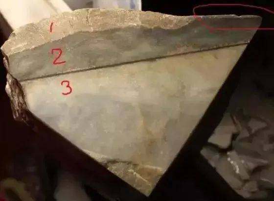 原石最后切出来就变成这一个样子,1:表皮;2:水沫子;3:砖头料