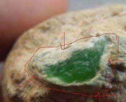 凡内部有条带状绿色翡翠分布的,与之对应的外表,总有反应。其特点是,不规则的条带状隆起,反应了硬度高于两侧的无色硬玉的部份。有时,沿隆起处有绿色小点显示,隆起区表皮的辉石颗粒,粒径细小,结构比外侧致密。这种现象,玉石商称“莽”。如果不具备这些特征,内部的绿色,很可能是灌色所致。