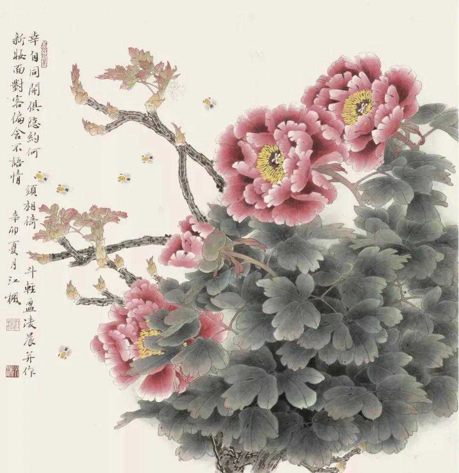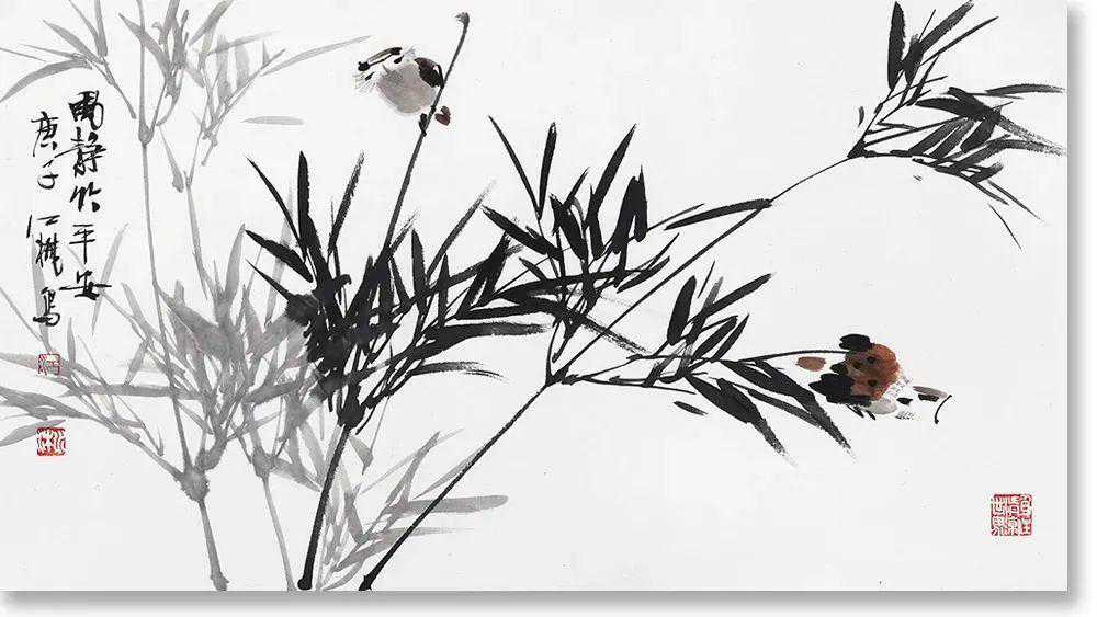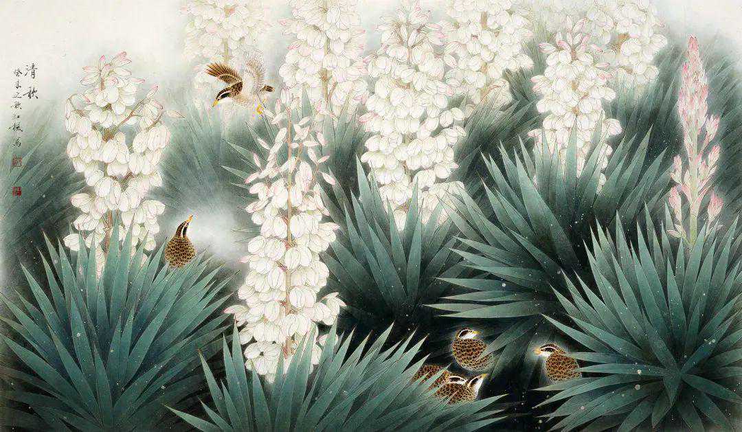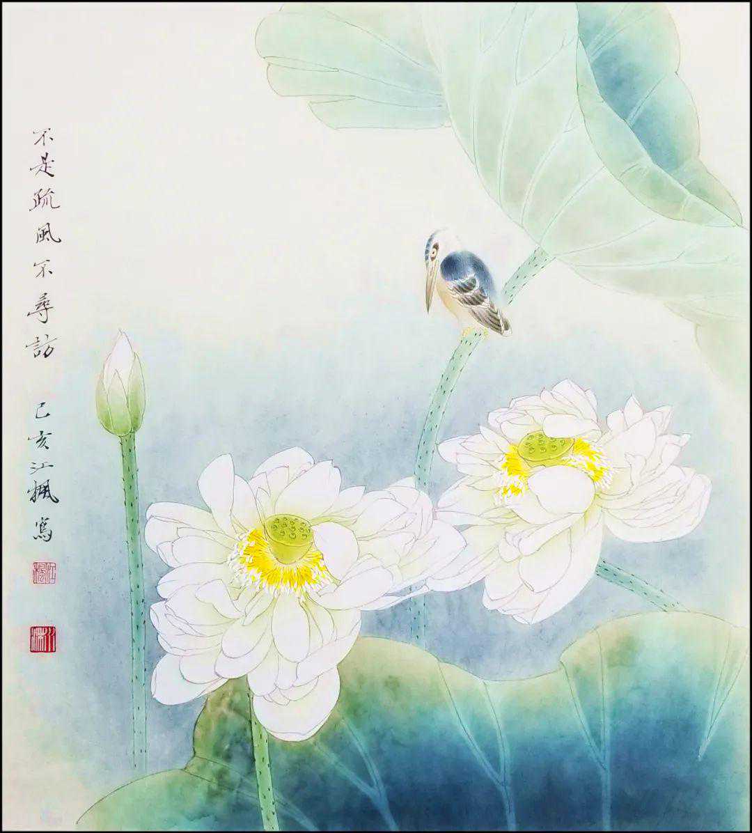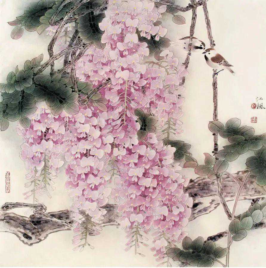 他的花鸟画“笔墨全在精神二字,所以一枝一叶了无尘碍,平静处自见幽微”。欣赏江水沐的画,便强烈地觉出他在师法造化时的馨香。透过画家笔下富有情调和韵律的花鸟,我们不仅体味到一种清新隽永、淡雅明丽的美,而且还能领略到作品中那静谧、灵动的神韵。