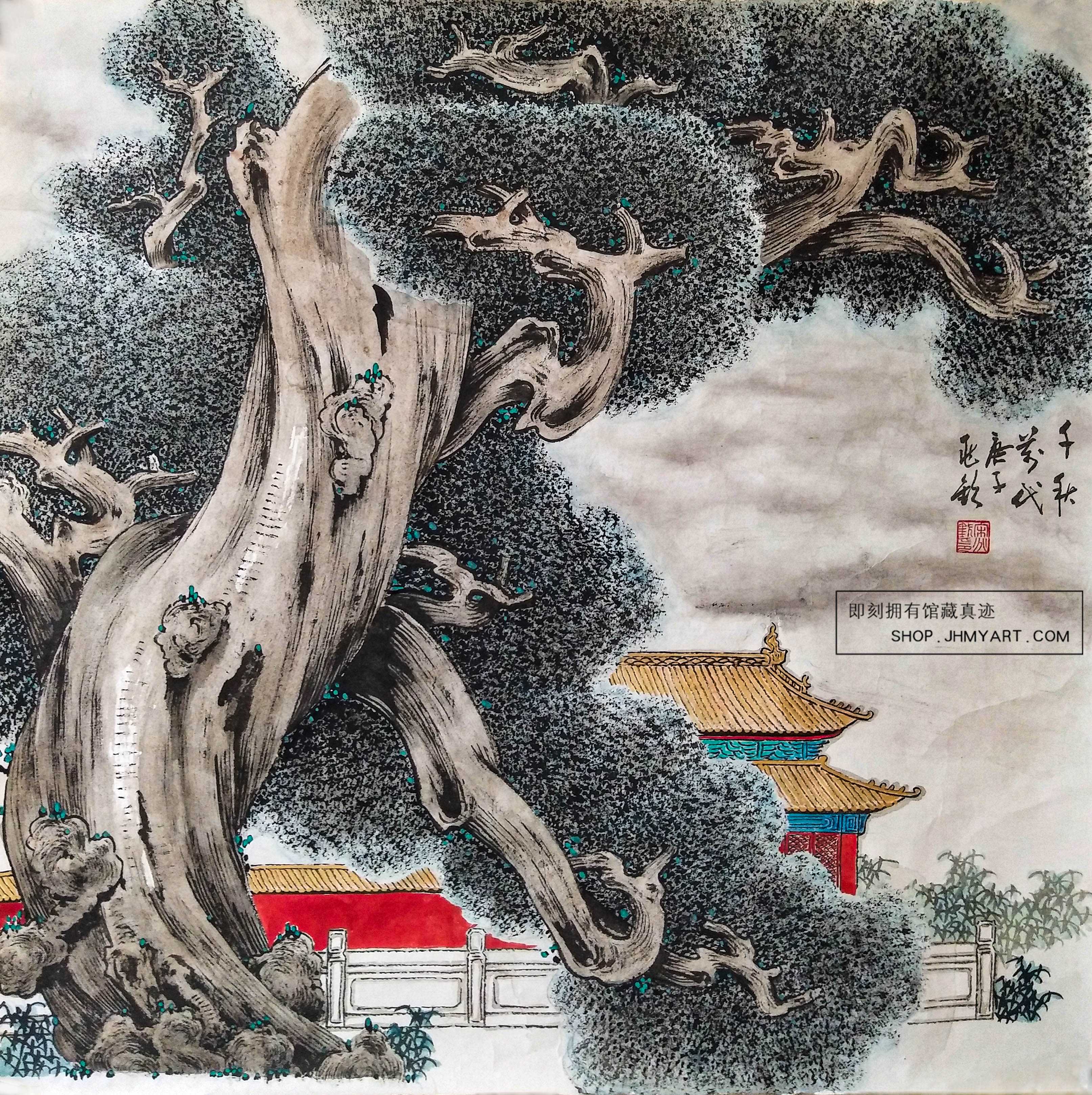 岁寒在天知后凋,受命于地禀正独。楂枒枝干撑青冥,凛然正色不可辱。柏树在中国的文化中拥有很高的地位,正如古人所说,凛然正色不可辱,它是奇倔、坚韧不拔的写照,是长寿、生命力旺盛的象征。正因为如此,柏树被我们多角度人格化,有人爱它长寿,有人爱它高洁,有人爱它坚韧。这幅作品取柏树之长寿入画,正如画家刻画出的虬劲、苍辣、枝繁叶茂,这些都是长寿的体现。