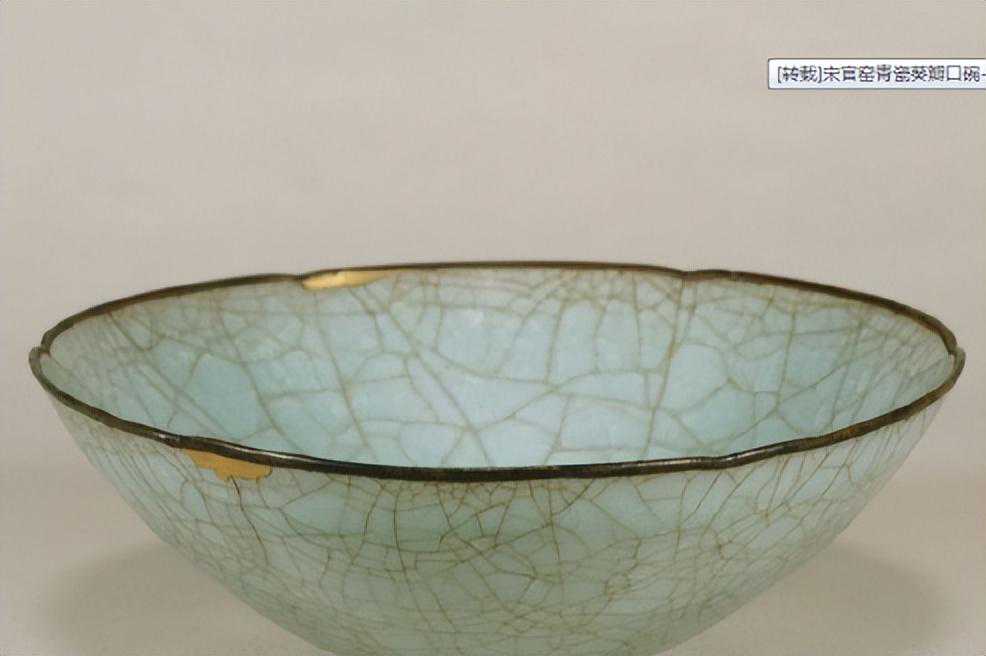 东京国立博物馆藏的龙泉窑青瓷碗,口径26.1厘米,敞口,口呈花瓣形,通体施淡粉青釉,釉质柔和滋润,开冰裂纹,口沿有磨损痕,镶铜口,此器造型端庄而精巧,是南宋龙泉窑仿官瓷中难得一见的珍品。
